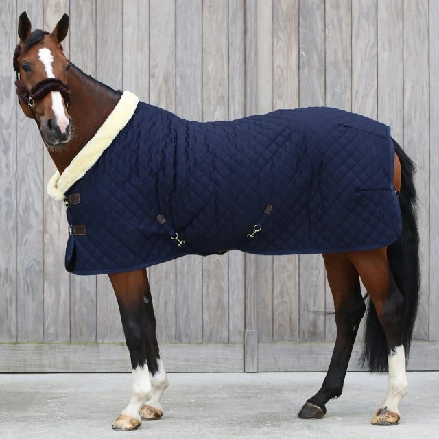 It is crafted with a 600D polyester with a smart diamond quilting. This material is extremely durable and prevents shavings and bedding from sticking to it. To prevent pressure on the shoulder and wither area, the collar of this rug is lined with artificial sheepskin. 160g of fibrefill, which has the same performance as down but does not absorb any smell, provides warmth in cooler weather.